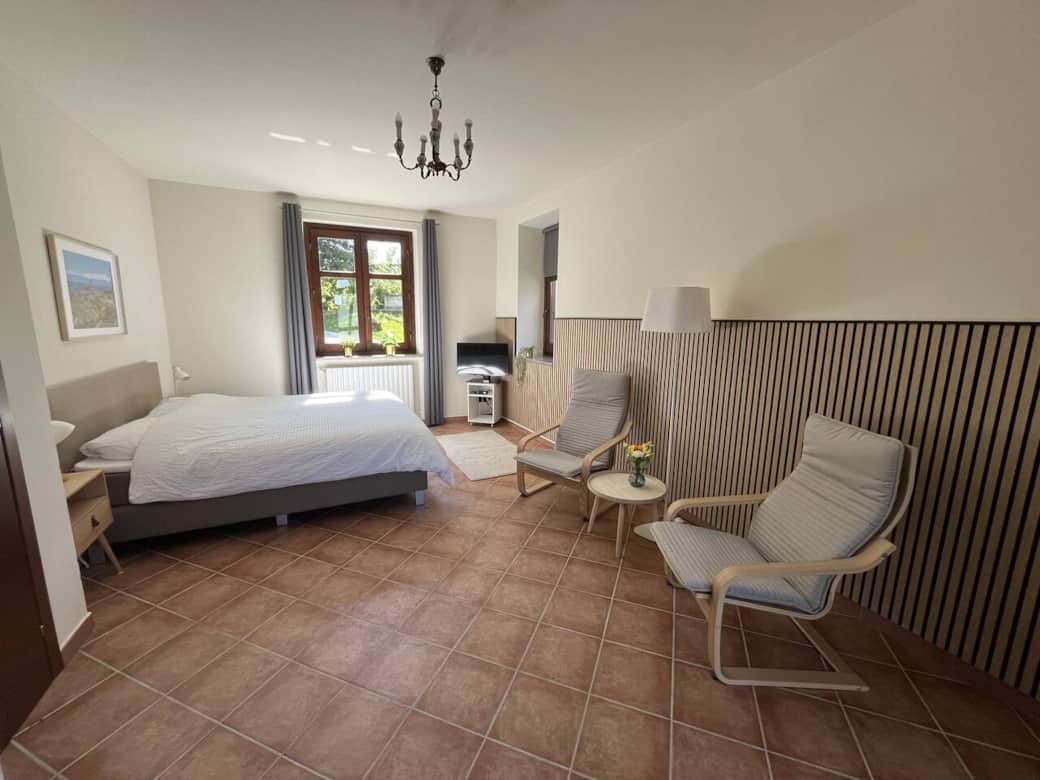 The studio is attractively furnished and combines living and sleeping in one open, light-filled space. Large windows provide plenty of natural light and offer beautiful views of the surrounding landscape. Here you wake up to silence, fresh air and the feeling of being completely detached from the hustle and bustle of everyday life.